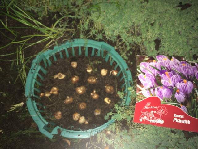 Ближе к дорожке осенью вкопала круглые контейнеры с луковичными.Весной они должны были дружно зацвести,если зимой не вымерзнут.